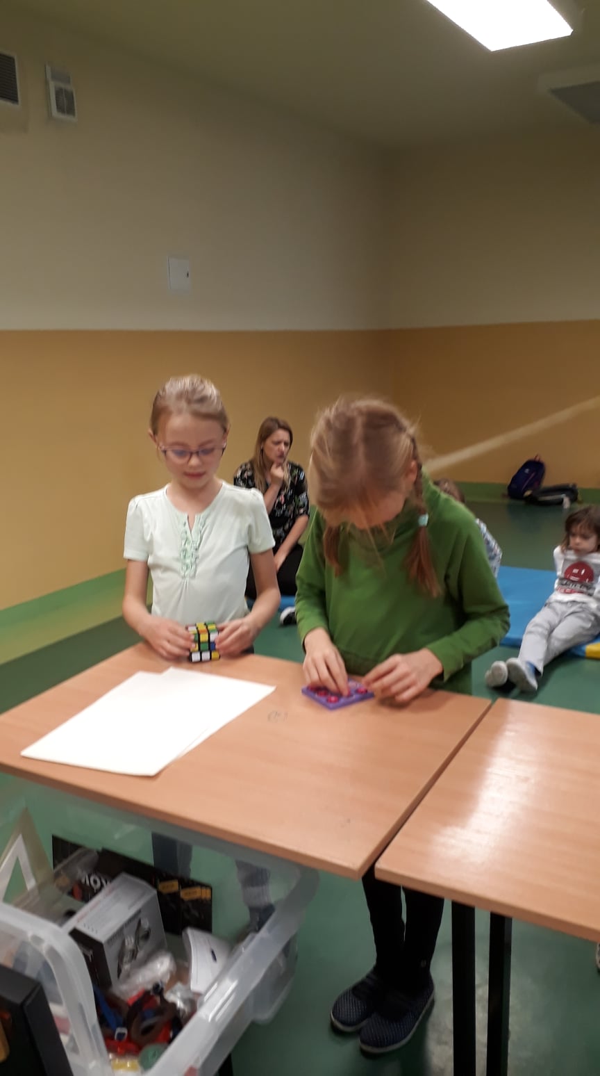 dwie dziewczynki stoją przy ławkach. dziewczynka po lewej układa kostke rubika, dziewczynka z prawej dopasowuje elementy w pudełku. Z tyłu nauczycielka z pozostałą częścią klasy siedzą na materacach