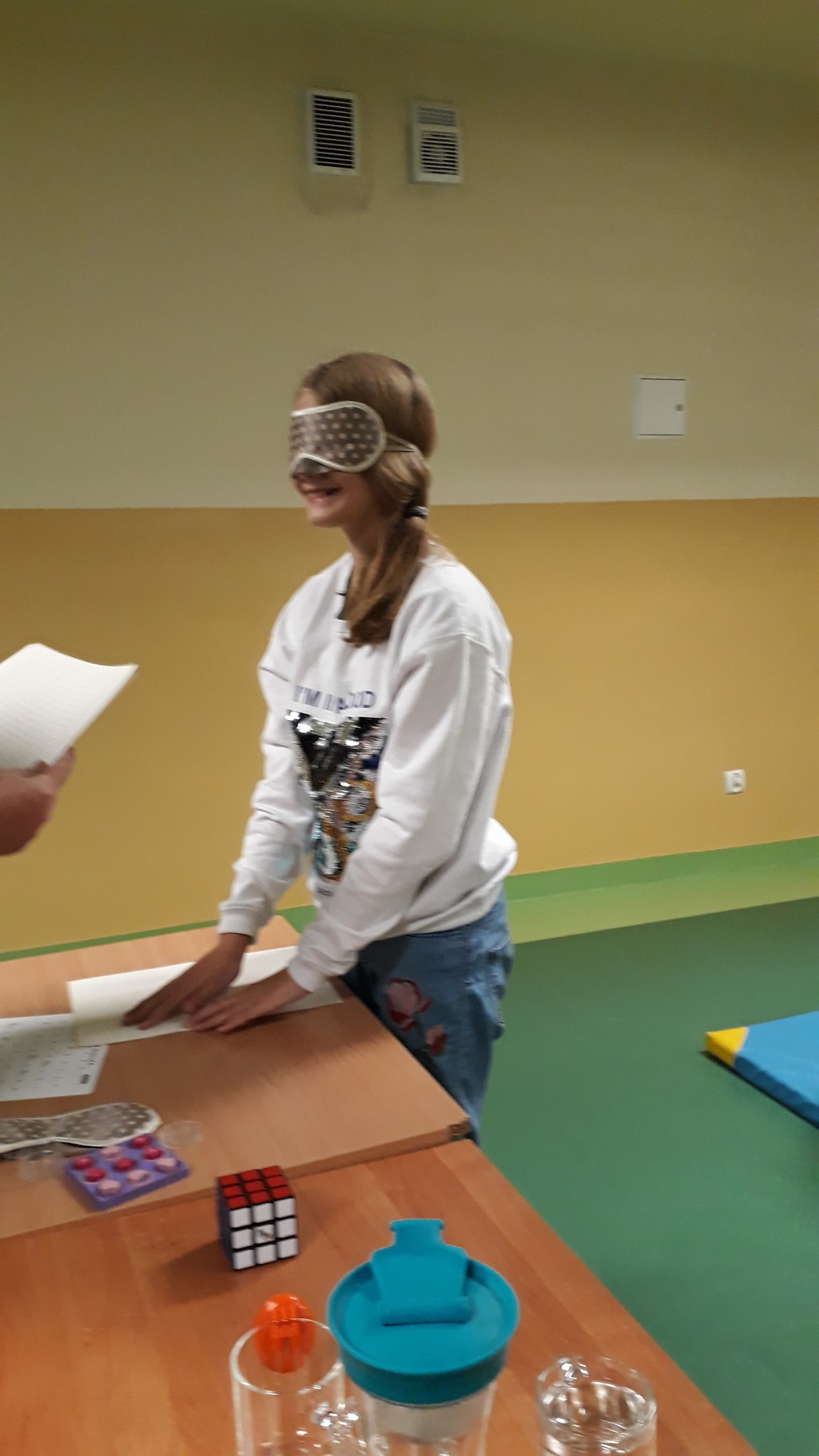 uczennica stoi przy ławce, ma zasłonięte oczy, przed sobą ma kartke z alfabetem braila. za nią leży materac. na ławce po jej lewej stronie kostka rubika, woda
