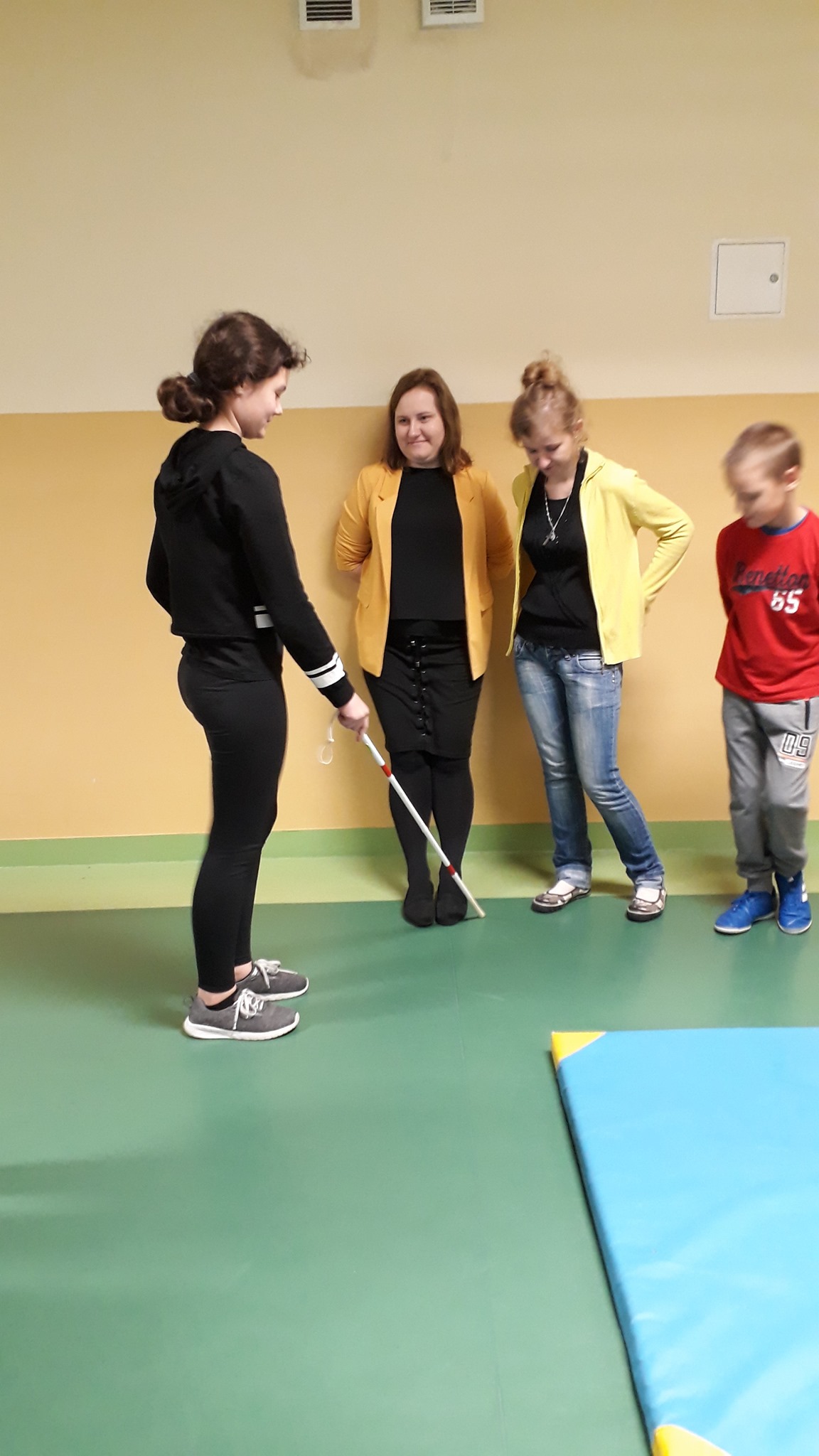 na zdjęciu 4 osoby: nauczycielka i troje uczniów, jedna uczennica ma w ręce laskę dla niewidomych, nauczycielka z resztą uczniów stoi pod ścianą